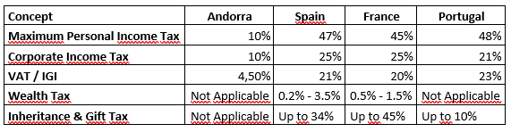 Compared to nearby countries such as Spain, France, or Italy, Andorra’s tax burden is significantly lower.